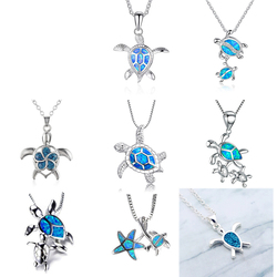 Gran oferta de moda para mujer y niña, joyería de tortuga marina oceánica bonita, collar con colgante de tortuga Chapado en plata con cuentas de piedra de ópalo azul