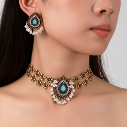 유럽과 미국 초커 빈티지 럭셔리 눈물 모양 라인 석 진주 페르시 실버 도금 펜던트 목걸이 귀걸이 세트