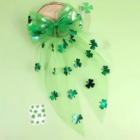 Spring Girl Women St. Patrick's Day Hairbow Accessory Green Mesh Fabric Clover Grass Print Bow Hair Clip Long Bowknot Hairpin