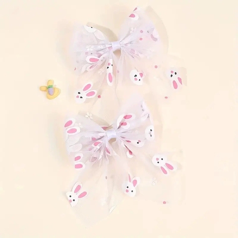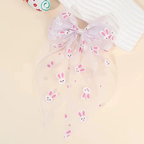 Hot Sell Fairy Cute Lovely Accessory Bunny Print Hair Bow Clip Mesh Fabric Rabbit Pattern Long Tail Hairbow Girl Kids Headwear